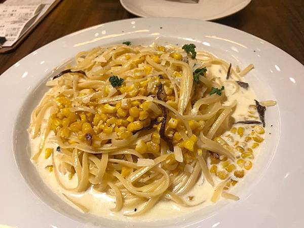 (烤玉米培根勳奶酪麵 430元)